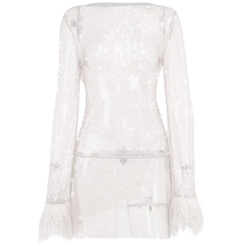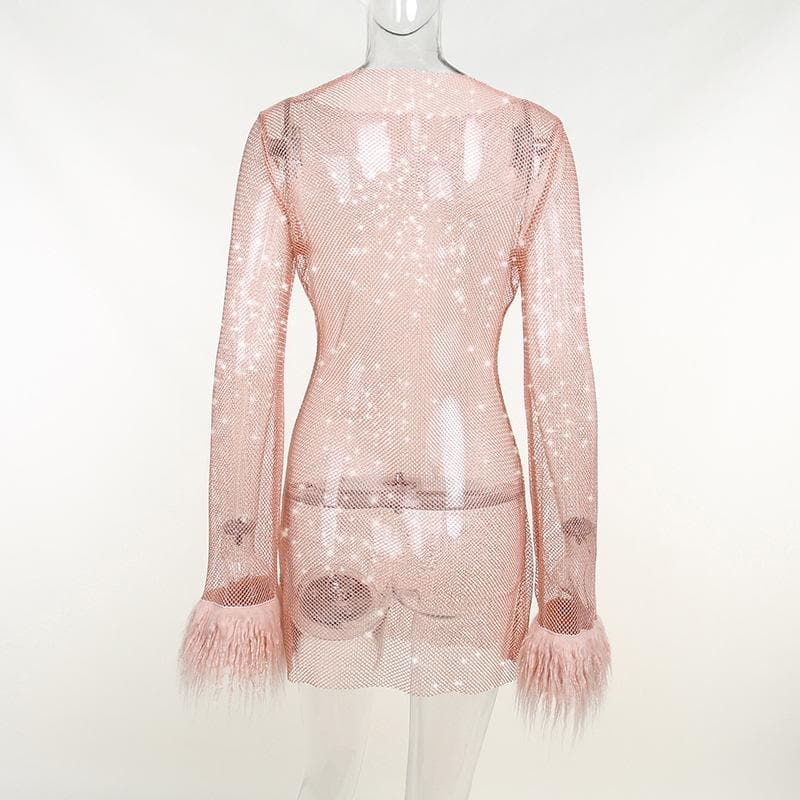 Be the first to review “Long sleeve solid see through sheer mesh fluffy round neck mini dress”